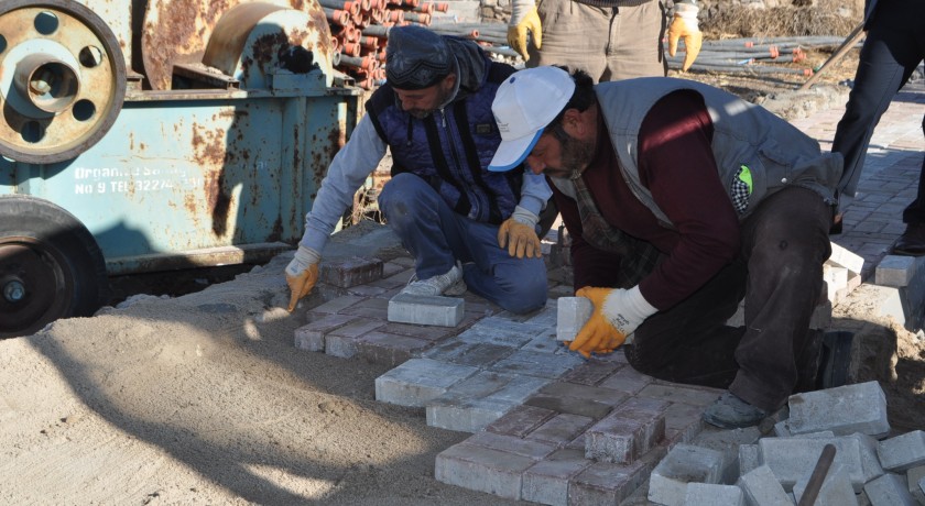 Nevşehir'in Acıgöl ilçesine bağlı Karapınar beldesinde belediyenin kaldırım düzenleme çalışmaları sürüyor.